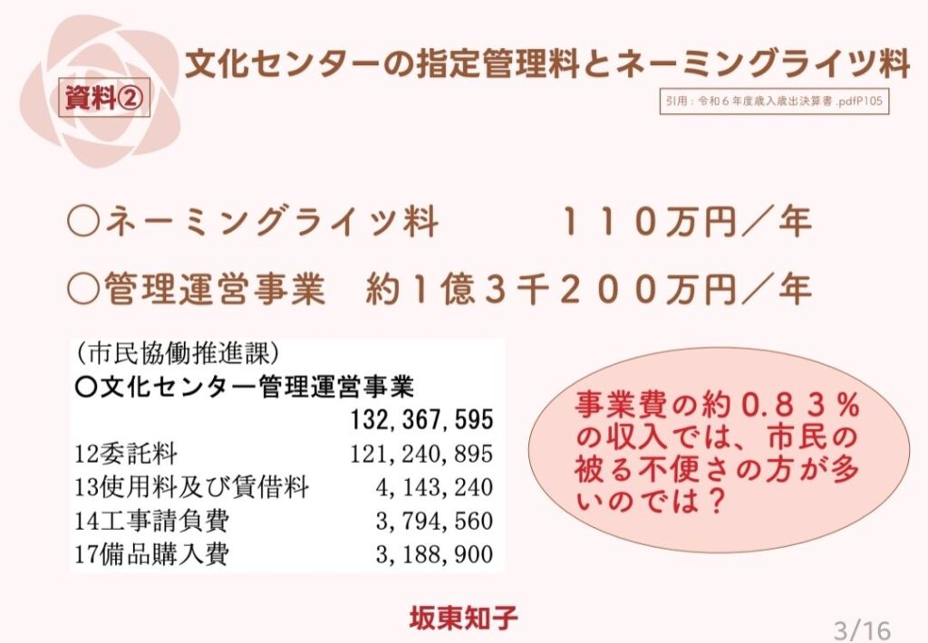 ネーミングライツ事業については、歳入増の効果があるとの事なので、維持管理費との割合で比較しました。文化センターの維持管理に年間1億3,200万円もの予算がかかっていることも市民のみなさまに知っていただきたいと思います。