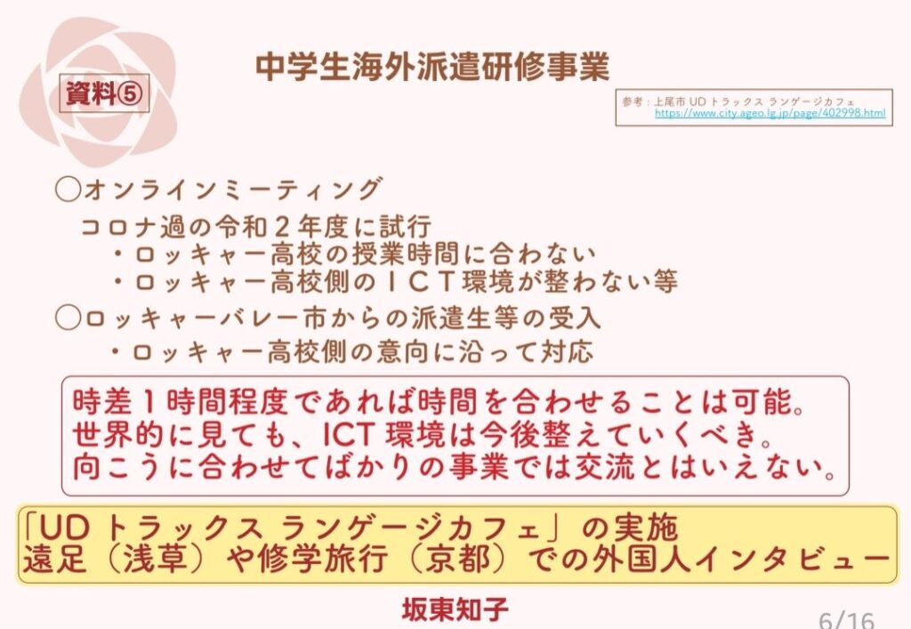 中学生海外派遣事業については、22名の生徒だけが対象で年間2,000万円以上もかかっているので、相互派遣やオンラインの提案をしました。また、市内企業の外国人従業員との交流や浅草など観光地での外国人インタビューでの交流を提案しました。