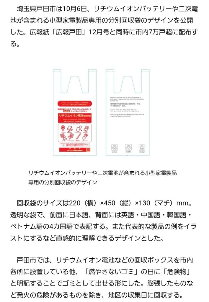 埼玉県戸田市が始めた、小型家電製品専用の分別回収袋は有効だと思います。上尾市も取り組んでいただきたいなと感じています。