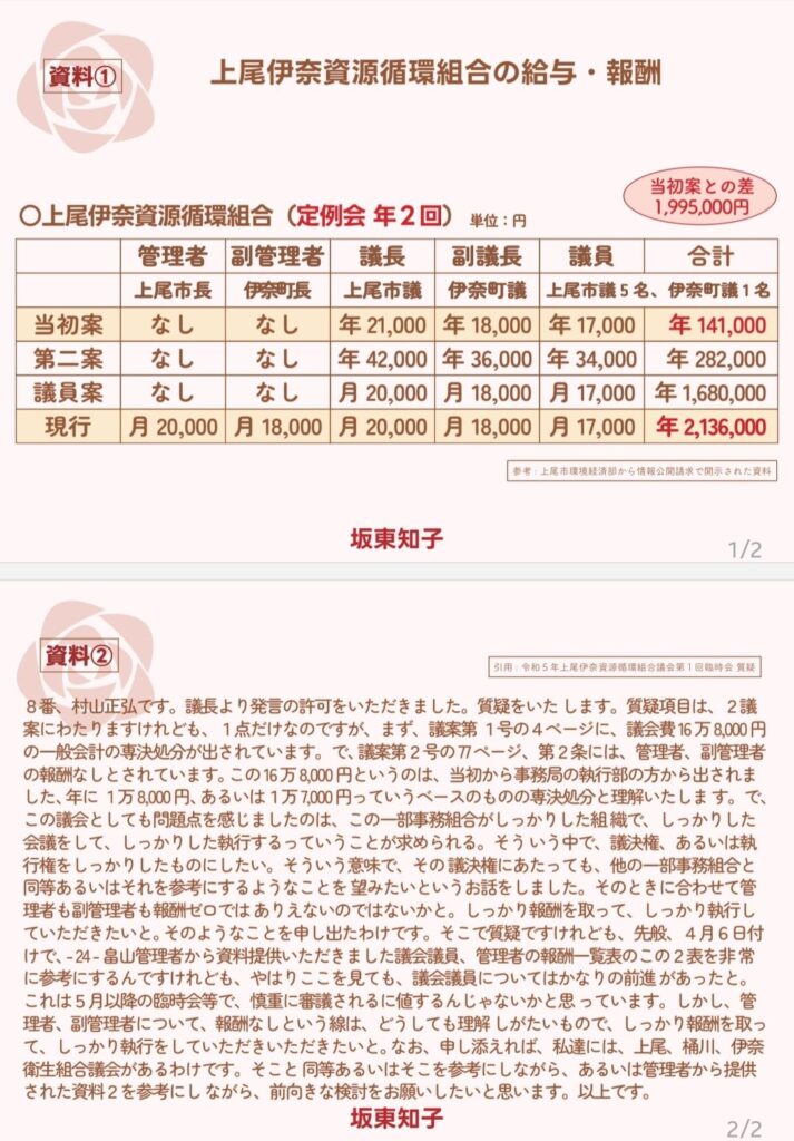 意)質問の答えになっていない。年2 回の定例会しか無い議会において年間 20 万円以上の給与が適正なのか考えていただきたい。私も組合議員となり、毎月 17,000 円の報酬をいただくが、仕事内容など自身で体感し、報酬に見合わないと思えば、また報酬について一般質問する。