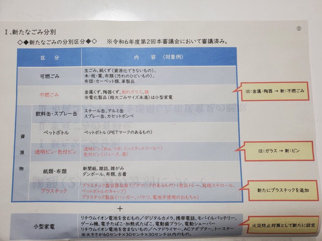 新たなごみ分別の区分とごみ収集区分の見直し案が、提示されました。