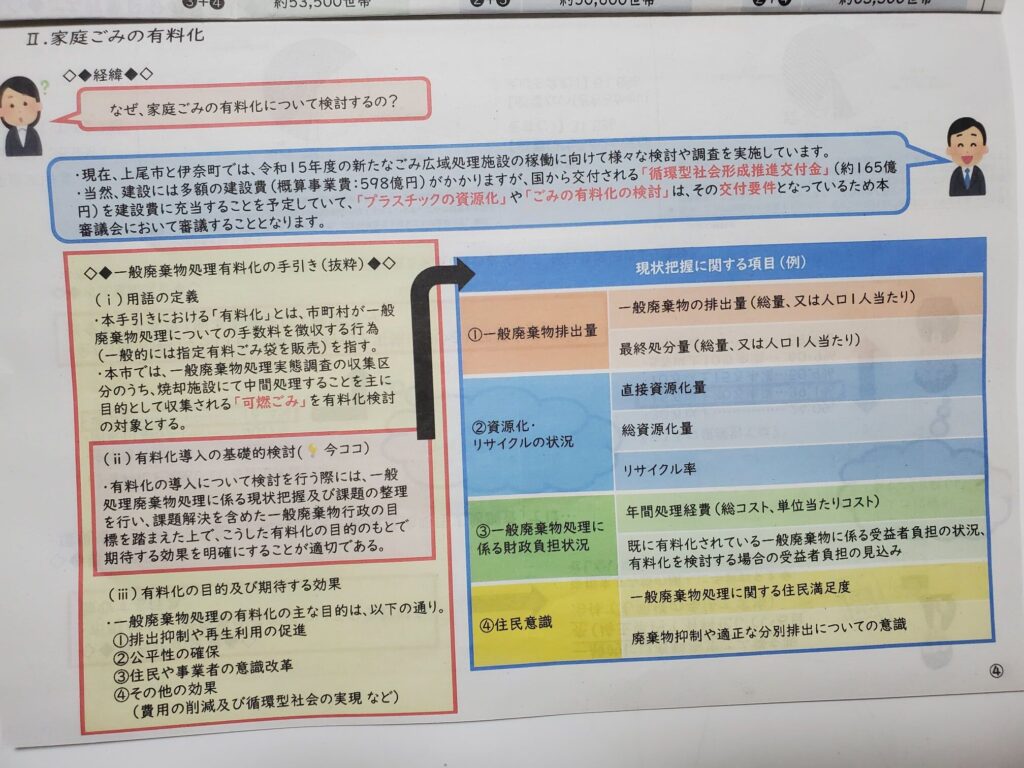 有料化については、戸別収集も説明にありましたが、経費が3倍になり小さな回収車の購入や有料ごみ袋も高額になるなど、難しい面が多いとの事でした。