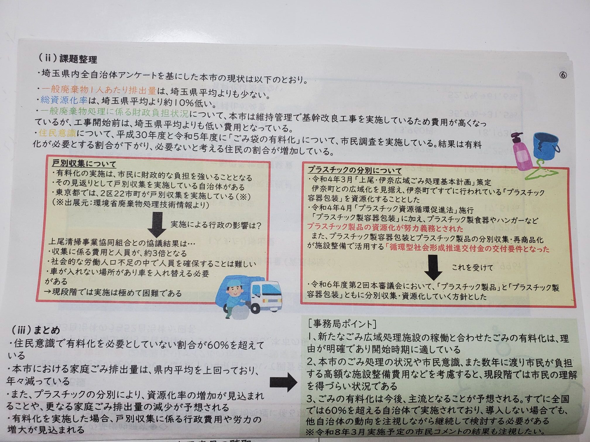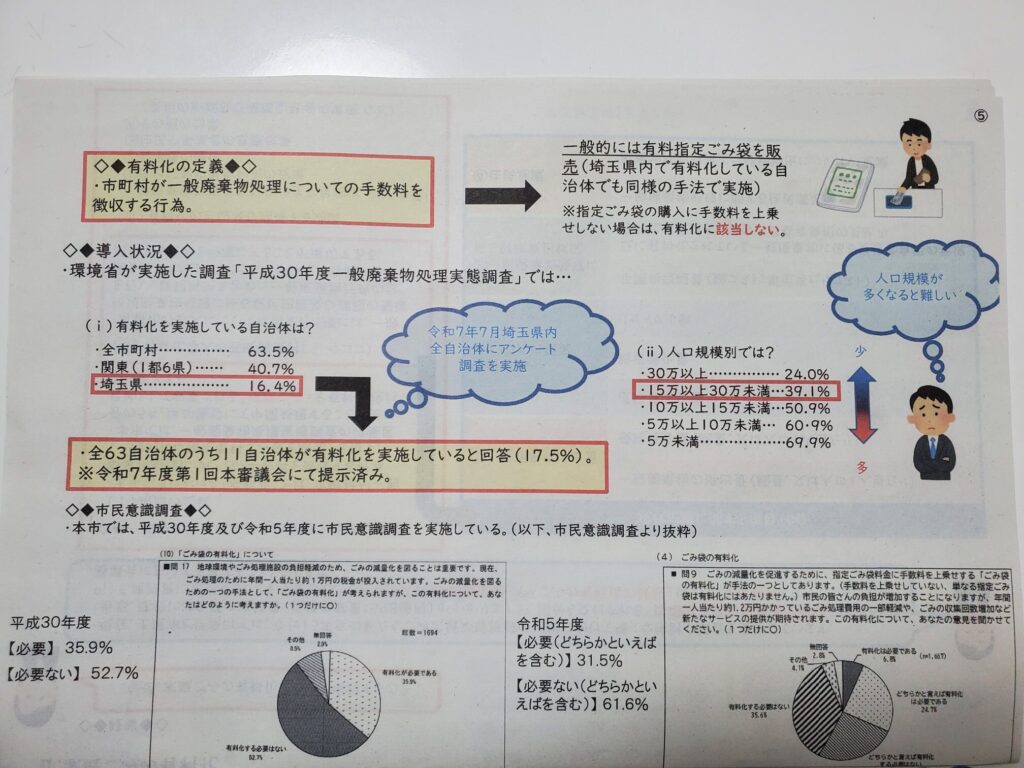 「以前住んでいた加須市では、平成25年に突然1枚25円のゴミ袋の有料化とともに、プラの分別も始まり、可燃ごみ、プラごみ、紙ごみの分別に家族で意識が変わりましたが、有料化は家族の多い家庭では負担が大きいので、できるだけ避けたい、ですので【ごみ減量トライアル】など、分別できなければ有料化になるかも…というような、市民意識改革に取り組んでみるのはいかがでしょうか?」と提案しました。