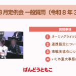 - R8.3.9令和8年3月定例会 一般質問令和8年3月定例会 一般質問(令和8年3月9日) ↓議会で使… 続きを読む: R8.3.9令和8年3月定例会 一般質問