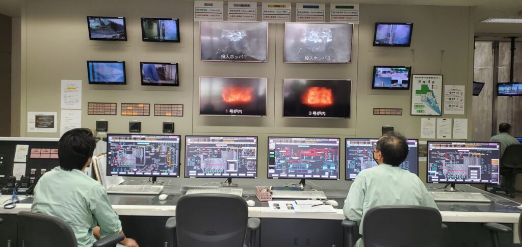 制御室も見せていただきました。燃えるゴミは5人体制で、24時間稼働しているそうです。