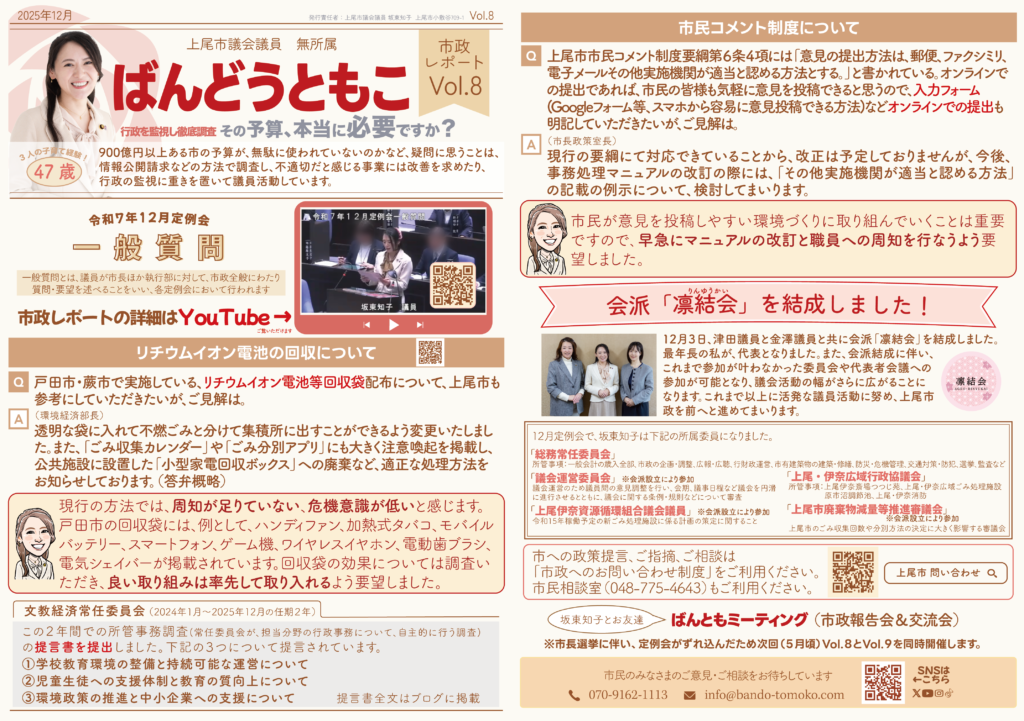 上尾市議会議員のばんどうともこです。 11月30日投開票の市長選挙により、令和7年12月定例会が、1月23日に閉会しました。 1月14日に行った一般質問については、こちらをご覧ください。↓↓↓ 令和7年12月定例会の一般 […]