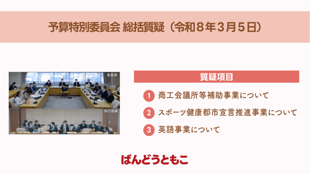 上尾市議会議員 坂東知子 予算特別委員会総括質疑(令和8年3月5日) ①商工会議所等補助事業について②スポーツ健康都市宣言推進事業について③英語事業について ブログもご覧ください↓ 予算特別委員会の総括質疑について なお […]
